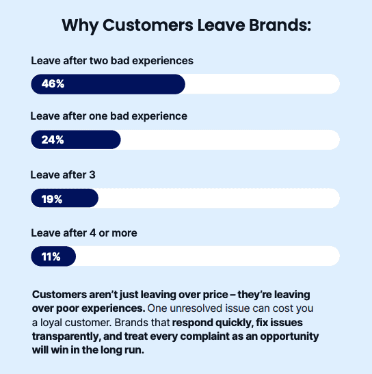Just look at the top reason people stop buying from brands. Survey data suggests that 24% of people won’t return to a brand following a single poor experience.