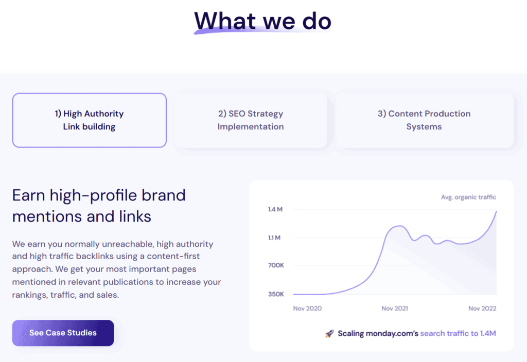Save on overhead by avoiding the need to recruit, train, or invest in enterprise SEO platforms. Instead, you get to leverage established infrastructure and expertise to scale quickly and way more efficiently.